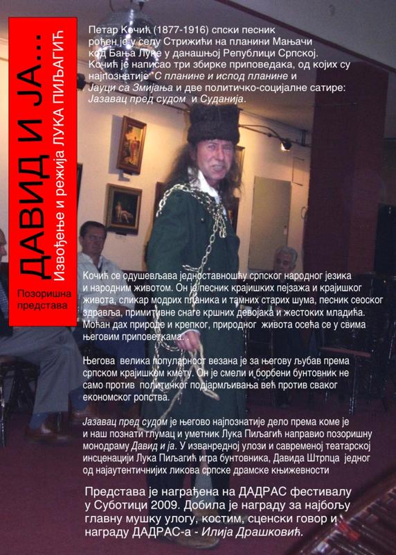 Слободарство Луке Пиљагића, не само као инстинкт него и као идеја ослоњена на наше најплеменитије наслеђе, највидљивије је у представи „Давид и ја“, према Кочићевом „Јазавцу пред судом“. Наш пораз је, између осталог, и у том фолклорном, шала-комика, свечана-академија приступу сопственом наслеђу, том репресивном мртваштву којим се успешно дезактивира свако дејство и сваки значај најслободарскијих слојева ове културе, а која је најбоља, и која је уопште култура, онда када је слободарска.
